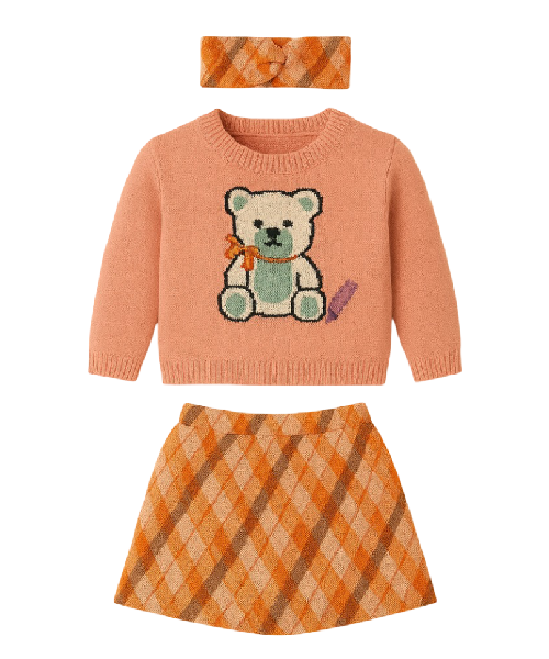 Both the skirt and headband are made from the same patterned. crisp Running Stitches and Back Stitches in a dark contrast thread (black/brown) to give the bear character and depth.